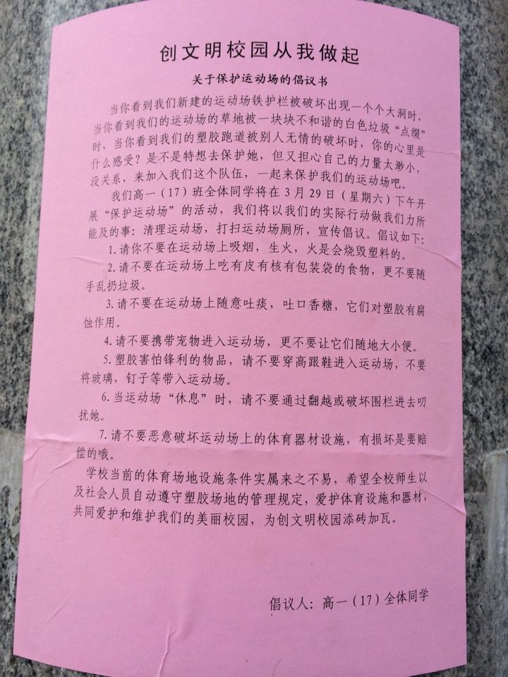在我校文明禮貌月活動如火如荼開展過程中,3月29日星期六下午,我校高一(17)班全體同學(xué)向全校發(fā)起保護(hù)運(yùn)動場的倡議,全班同學(xué)以主人翁的意識積極參與清理運(yùn)動場的工作。