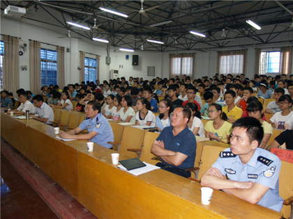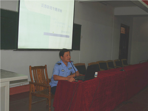 縣公安局局長姜超首先介紹了當(dāng)前國際國內(nèi)反恐形勢,著重講述了反恐重點目標(biāo)的安全防范和反恐防范常見安全隱患及問題??h公安局劉副局長、我校法治副校長宋進(jìn)錄、縣公安局指揮中心潘主任等領(lǐng)導(dǎo)親臨講座現(xiàn)場。