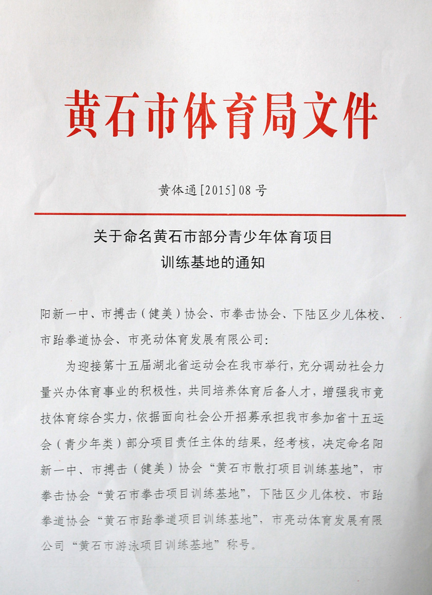 我校被授予“黃石市散打項(xiàng)目訓(xùn)練基地”