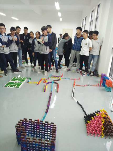 多米諾骨牌發(fā)源于中國(guó),在歐美社會(huì)中則蔚為流行,是一種綜合德智體美勞的運(yùn)動(dòng),可以培養(yǎng)當(dāng)代中小學(xué)生的團(tuán)隊(duì)協(xié)作能力,考驗(yàn)學(xué)生體力、耐心、意志力和臨場(chǎng)應(yīng)變能力,提高學(xué)生的動(dòng)手能力。在第四屆體育科技文化藝術(shù)節(jié)中,我校再次將多米諾骨牌納入科技比賽項(xiàng)目?jī)?nèi)容,11月17日(周五)晚上,柯賢根老師對(duì)每個(gè)年級(jí)選派的隊(duì)伍進(jìn)行相關(guān)培訓(xùn)。正式比賽于11月23日下午2:30在新校區(qū)至高樓三樓機(jī)器人實(shí)驗(yàn)室舉行。經(jīng)過緊張、激烈、漫長(zhǎng)的比賽過程,評(píng)委從骨牌倒塌情況、圖案設(shè)計(jì)和寓意解說等幾個(gè)方面進(jìn)行打分,依據(jù)平均分高低依次決出特等獎(jiǎng)團(tuán)隊(duì)一個(gè)、一等獎(jiǎng)團(tuán)隊(duì)兩個(gè)、二等獎(jiǎng)團(tuán)隊(duì)兩個(gè)。