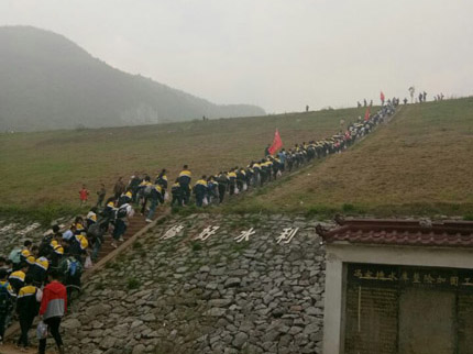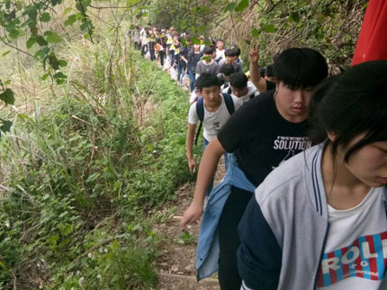 這是一次磨煉之旅。從早八點出發(fā),到下午將近四點返回,歷經(jīng)近八個小時。從登山,到返程,行程約三十公里。有的同學(xué)鞋磨破了,有的腿走痛了,甚至有的同學(xué)腿抽筋了,有的同學(xué)腳崴了,有的同學(xué)胸悶(馬一同學(xué)第一次登父子山因胸悶而中途放棄)……沒有任何因素能阻止,552名同學(xué)全部登頂。