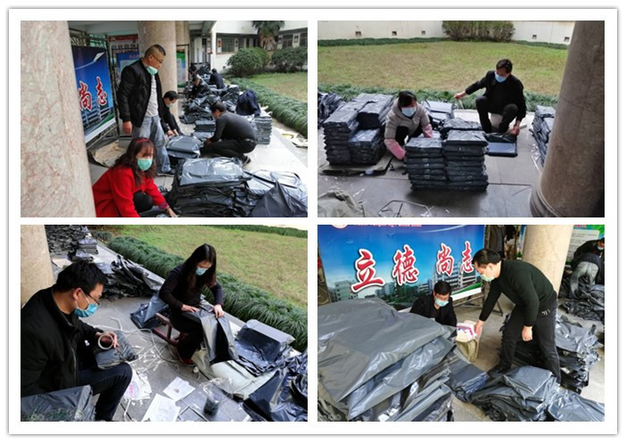 3月15日,陽新縣封城解禁后的第二天,陽光明媚,春意盎然。主管高一年級副校長梁師穩(wěn)精心組織,16名教師主動請纓,完成了教輔資料配送的前期工作。1200多名學(xué)生,9門學(xué)科,近10000本資料,16人歷經(jīng)9個(gè)小時(shí),終于將學(xué)生的教輔資料打包好,明天將交付給郵政快遞投遞。