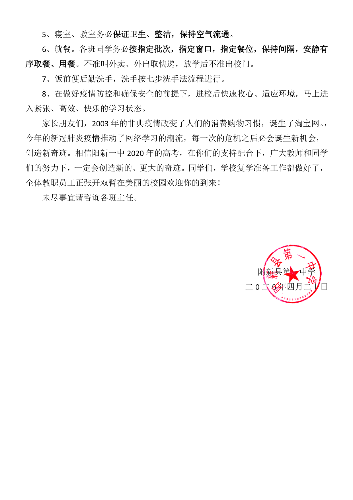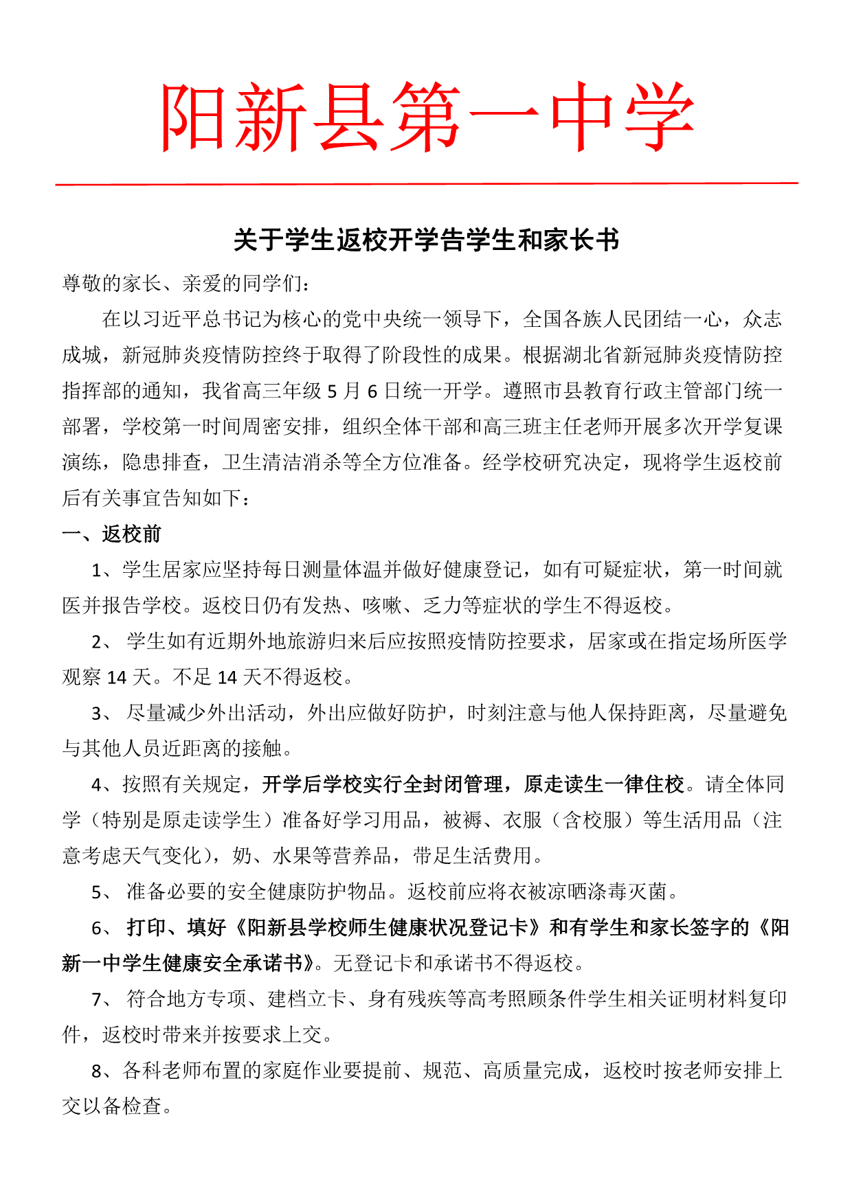 陽新一中關(guān)于學(xué)生返校開學(xué)告學(xué)生和家長書