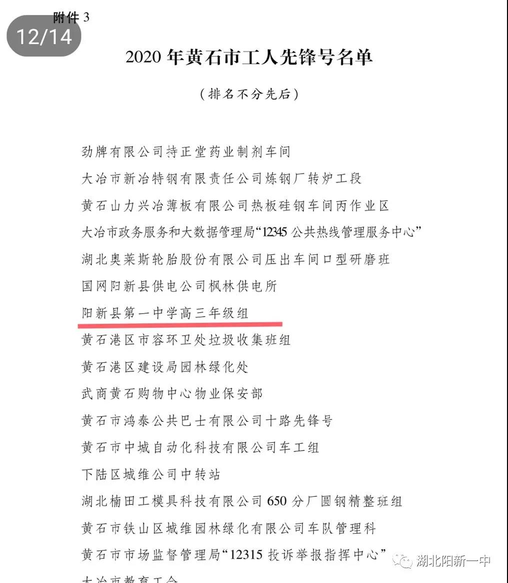 喜報(bào)———陽(yáng)新一中高三年級(jí)榮獲“黃石市工人先鋒號(hào)”