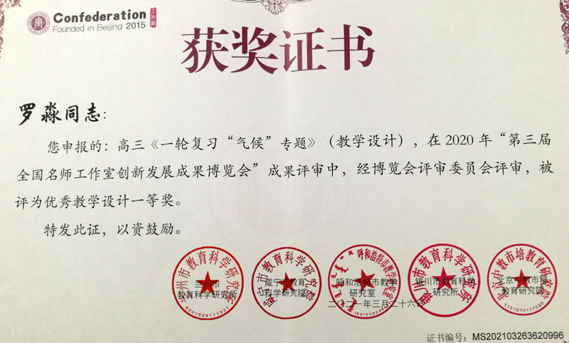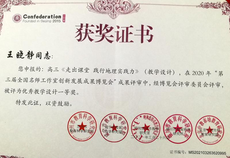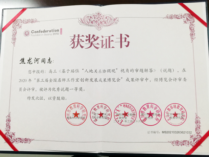 在2020年度“第三屆全國(guó)名師工作室創(chuàng)新發(fā)展成果博覽會(huì)”成果評(píng)審出爐中,黃石名師焦龍河工作室(高中地理)系列成果經(jīng)博覽會(huì)評(píng)審委員會(huì)評(píng)審,喜獲七個(gè)一等獎(jiǎng);包括“全國(guó)名師工作室創(chuàng)新發(fā)展成果”一等獎(jiǎng)1項(xiàng),“優(yōu)秀說課”成果一等獎(jiǎng)1項(xiàng),“優(yōu)秀說題”成果一等獎(jiǎng)2項(xiàng),“優(yōu)秀教學(xué)設(shè)計(jì)”成果一等獎(jiǎng)3項(xiàng)。具體情況如下:
