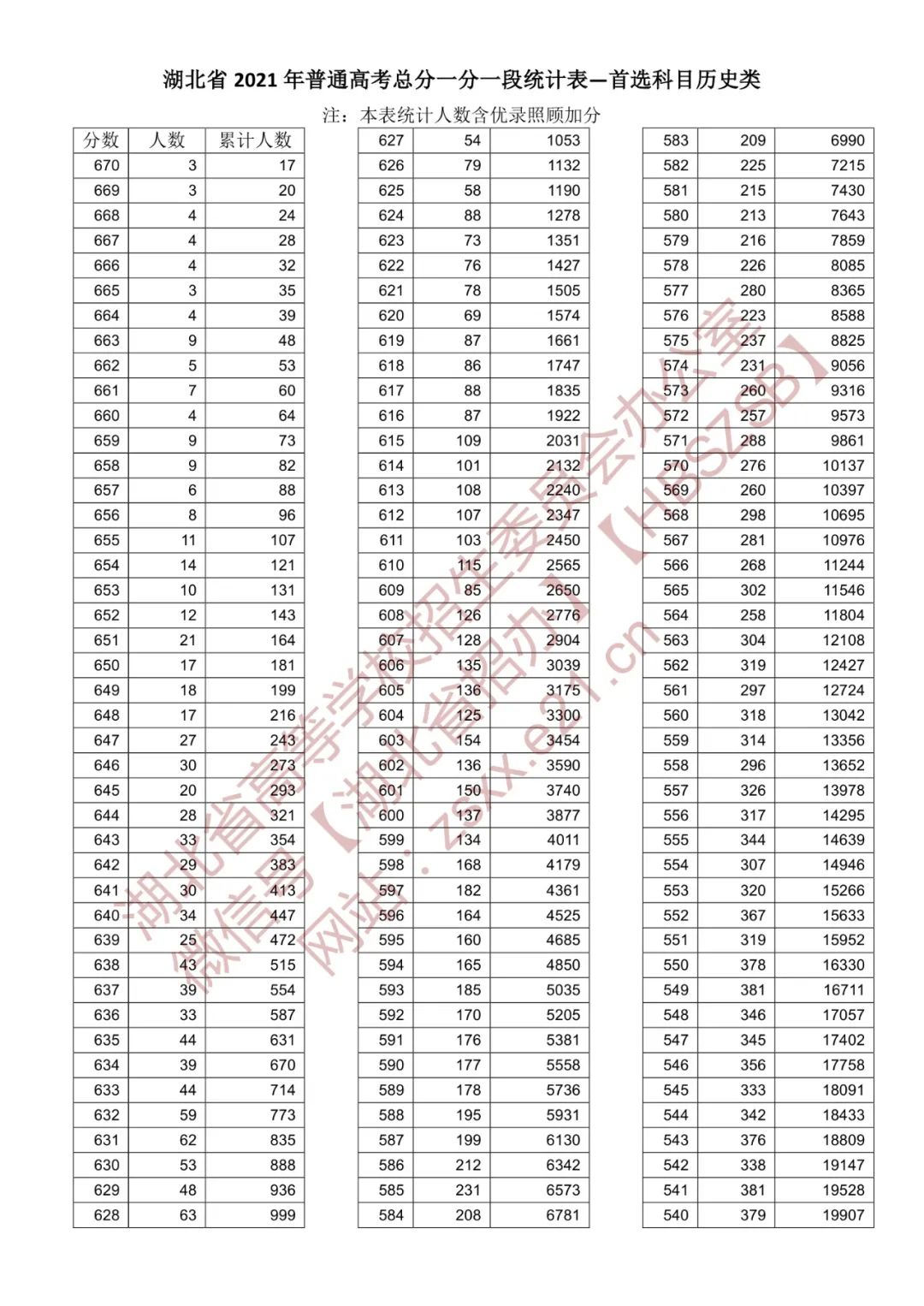 湖北省2021年普通高校招生排序成績一分一段統(tǒng)計表(首選歷史)
