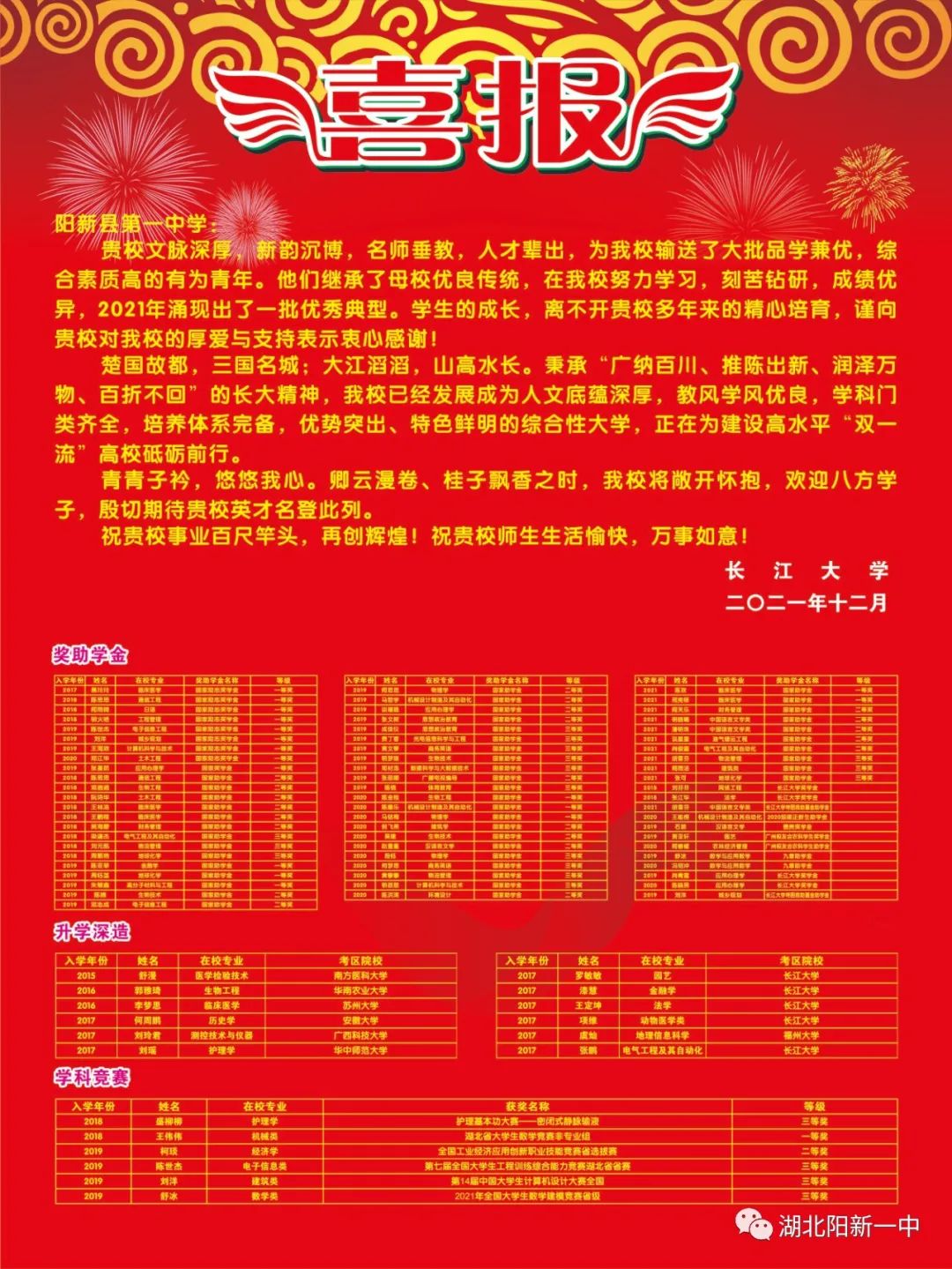 近些年來,清華大學(xué)、同濟大學(xué)等多所高校向我校發(fā)來喜報,感謝學(xué)校多年來一直為各高校輸送優(yōu)秀人才。喜報展現(xiàn)了我校畢業(yè)生在各高校學(xué)習(xí)刻苦努力、成績優(yōu)異、綜合表現(xiàn)突出,獲得多項獎勵。我校學(xué)子們突出的綜合素質(zhì)、良好的發(fā)展?jié)撃苴A得了錄取高校的普遍贊賞,這既是對學(xué)校辦學(xué)成果的高度肯定,也是對全校師生的巨大激勵,必將助力更多一中學(xué)子考入名牌大學(xué)。學(xué)校期待未來與各高校緊密互動,共同為國家輸送更多卓越人才。