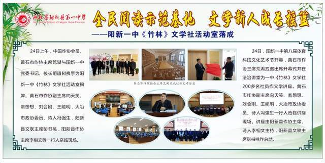 一中前行,得眾人之力。陽新一中克服經(jīng)費(fèi)困難,籌集社會資金十萬余元,建成了《竹林》文學(xué)社活動室。2021年11月24日,黃石市作家協(xié)會主席荒湖及市作協(xié)主席團(tuán)成員向天笑、翁想想、劉會剛、王能明,陽新縣文聯(lián)主席彭書桃,陽新縣作家協(xié)會主席李相文等出席揭牌儀式。