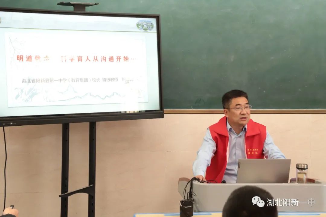 聽評(píng)課活動(dòng)后,黃石市明道樹語文名師工作室主持人、陽新一中校長(zhǎng)明道樹作主題為《明道優(yōu)術(shù),科學(xué)育人從溝通開始》的報(bào)告。