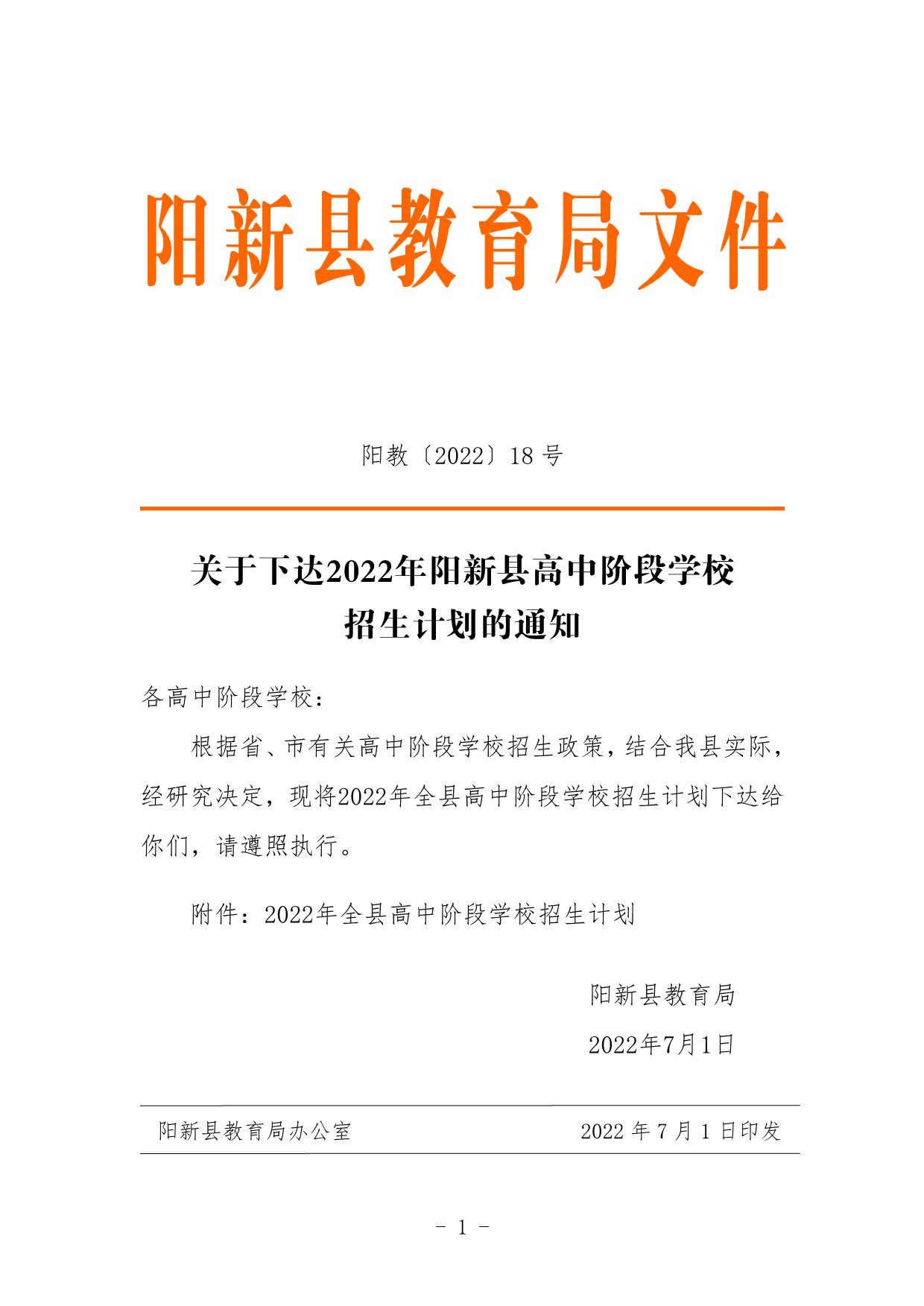 關(guān)于下達(dá)2022年陽新縣高中階段學(xué)校招生計劃的通知