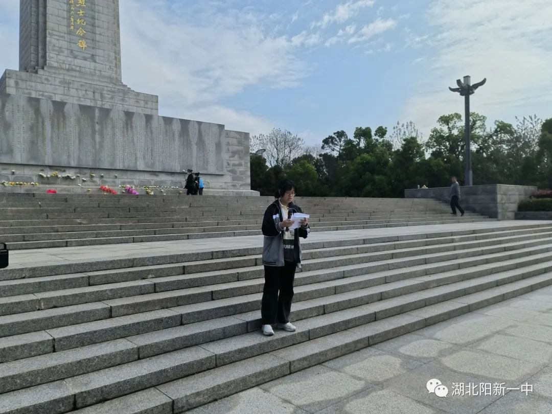 班主任陳洪星老師在革命烈士紀(jì)念碑前進行主題講話,他說道:“今天的幸福生活來之不易,我們更應(yīng)應(yīng)該懂得珍惜,以實際行動告慰烈士的忠魂,接好時代的接力棒,傳承發(fā)揚革命先烈不怕犧牲、不怕困難的革命精神,肩負(fù)起歷史的責(zé)任和使命,向著英雄的方向前進!”