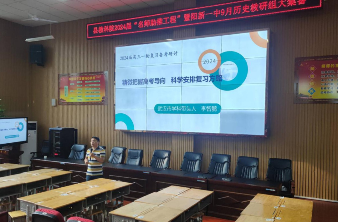 金秋九月,丹桂飄香。為深入推進我校教學(xué)改革,凝聚發(fā)展共識,助力2024屆高三復(fù)習(xí)備考工作,9月27日下午,陽新縣2024屆“名師助推工程”暨陽新一中9月歷史組大集備在我校明德樓學(xué)術(shù)報告廳舉行。活動由我校歷史教研組長石教德老師主持,我校歷史組蹲組校領(lǐng)導(dǎo)李雁鳴蒞臨指導(dǎo),學(xué)校全體歷史老師和來自全縣各高中學(xué)校的部分歷史老師參與活動?;顒犹匮錆h市學(xué)科帶頭人李智鵬老師作歷史一輪復(fù)習(xí)備考指導(dǎo)。