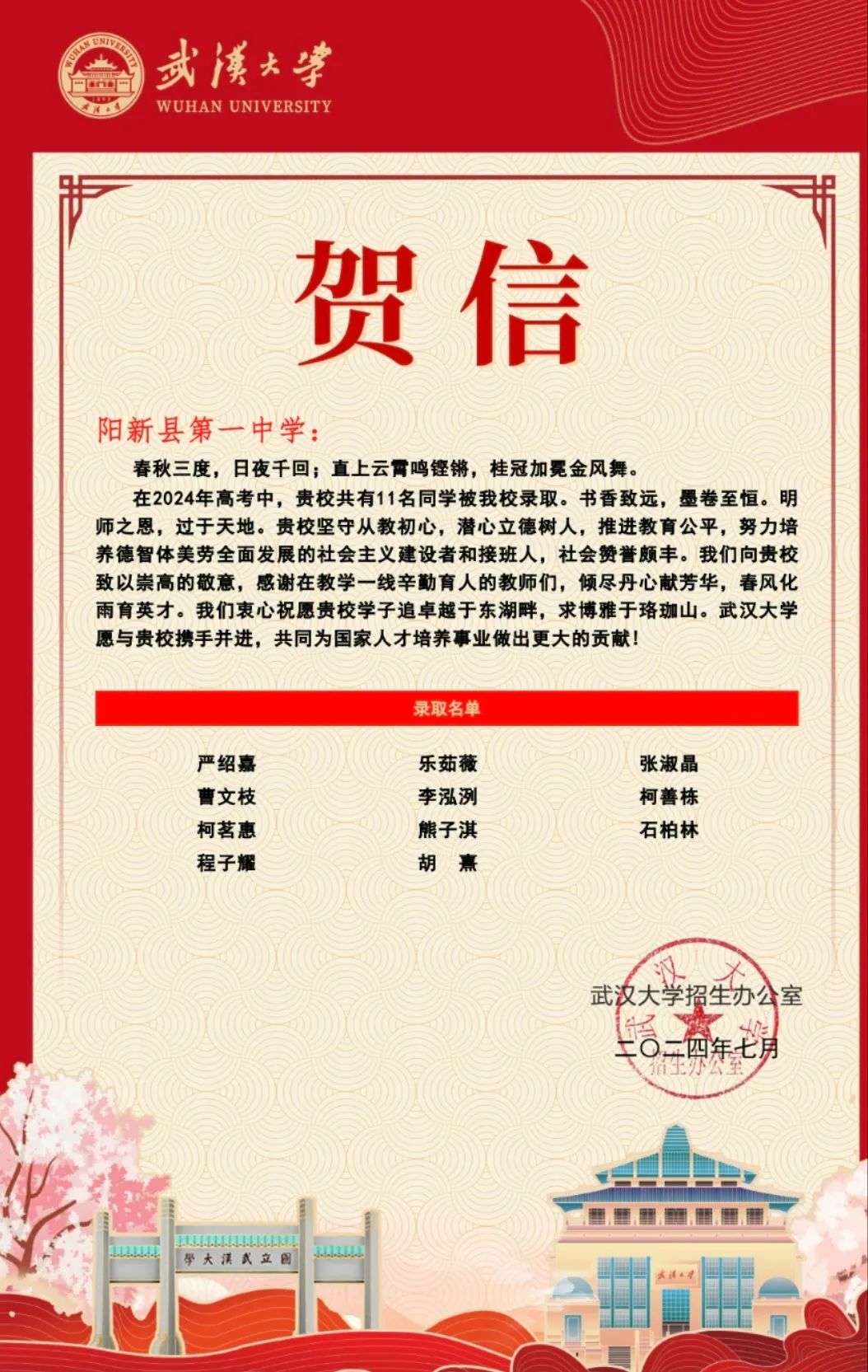武漢大學(xué)向我校發(fā)來喜報(bào)!熱烈祝賀嚴(yán)紹嘉等11名同學(xué)金榜題名!