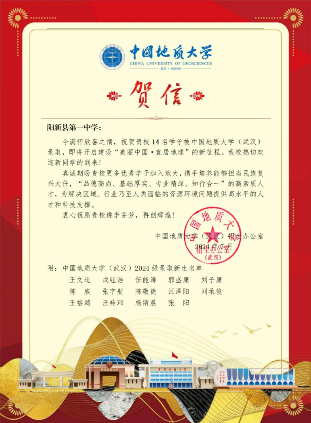 期待錄取學(xué)子秉承陽新一中“立德、尚志、篤學(xué)、創(chuàng)新”的校訓(xùn),發(fā)揚(yáng)“愛國好學(xué)、奮發(fā)自強(qiáng)、團(tuán)結(jié)拼搏、勇爭第一”的一中精神,在未來的學(xué)習(xí)生活中不負(fù)韶華,砥礪前行!