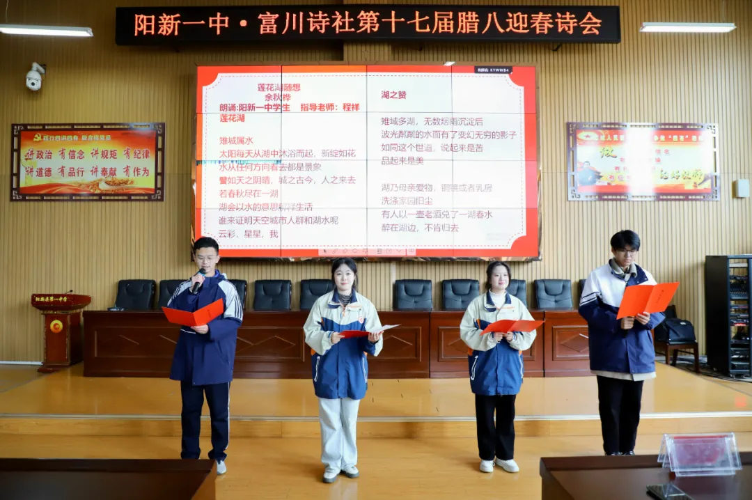 一中師生與富川詩社詩友誦讀一首首或自己創(chuàng)作的作品或選取典籍的膾炙人口的詩詞,伴隨或舒緩或激昂的音樂,在朗誦者聲情并茂的演繹中把臘八迎春詩會推向一個又一個高潮。