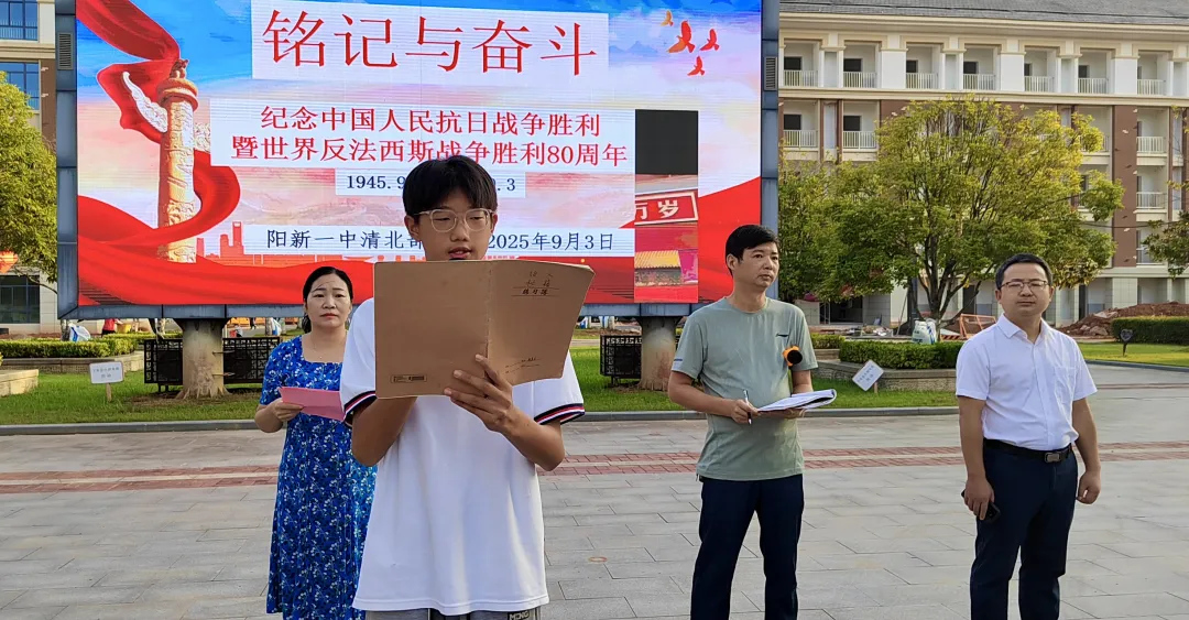 五、凝聚力量,共創(chuàng)嶄新輝煌。精神如炬,使命如磐。用偉大抗戰(zhàn)精神熔鑄人生志氣,以愛(ài)國(guó)情懷激蕩奮進(jìn)力量,珍惜光陰,努力拼搏,涵養(yǎng)品格,鍛煉身心,用勤奮和智慧,用汗水和熱情,去書(shū)寫(xiě)屬于我們陽(yáng)新一中清北部每一位學(xué)子的精彩篇章!