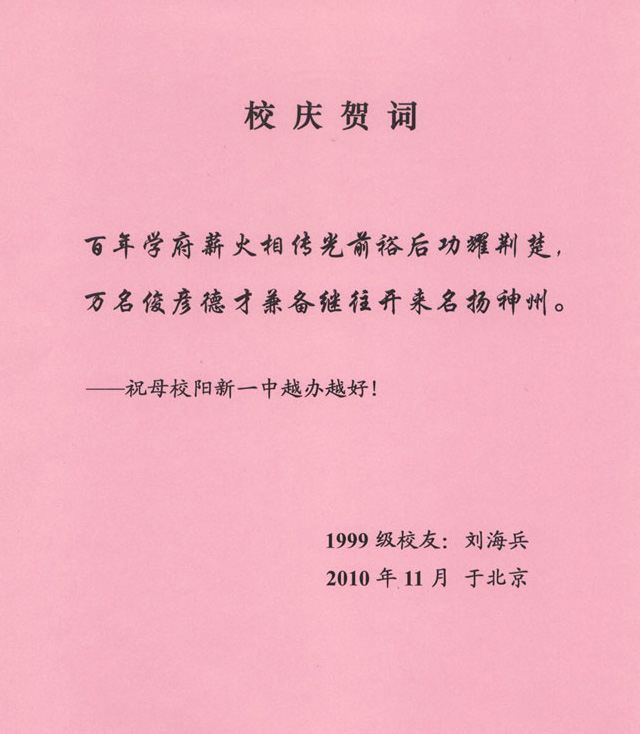 2002屆校友劉海兵為母校生日發(fā)來(lái)賀詞