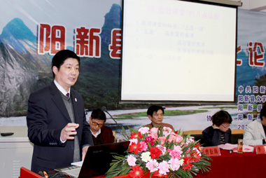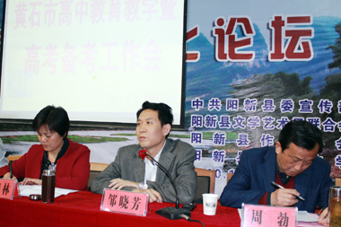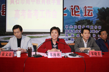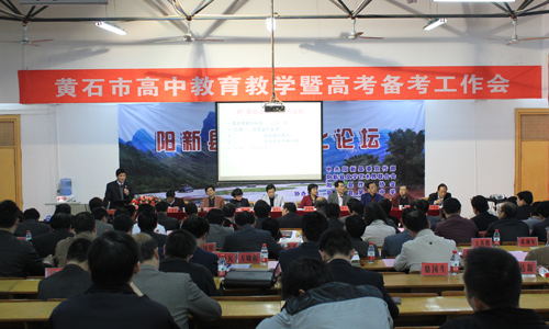 四十分鐘后他們回到會場,“黃石市高中教育教學(xué)暨高考備考工作會”在陽新一中的學(xué)術(shù)報告廳正式開始。黃石市教育局副局長童文清主持會議,陽新縣委常委、宣傳部長鄒曉芳致辭,熱烈歡迎各位領(lǐng)導(dǎo)、各位專家的到來。陽新一中校長趙立中作了題為《在復(fù)習(xí)教學(xué)中追求“高效課堂”》的典型發(fā)言,他在發(fā)言中闡述了什么是“有效教學(xué)”?什么是“高效課堂”?提出在復(fù)習(xí)教學(xué)中應(yīng)該進行三個研究:“研究學(xué)情,排除教學(xué)的盲目性;研究考點,講求教學(xué)的針對性;研究考題,講求訓(xùn)練的方向性?!闭J為高三學(xué)生復(fù)習(xí)要做到三個字:“穩(wěn)、苦、準(zhǔn)”。大冶市教育局、陽新縣教育局分別作了匯報性發(fā)言,黃石市教科院領(lǐng)導(dǎo)對三月份的“八市聯(lián)考”作了全面分析,對黃石高考備考的工作提出了建設(shè)性建議。黃石市政府教育督導(dǎo)室副主任周勃在會上作了總結(jié)性發(fā)言,他客觀地分析了黃石市高考面臨的形勢,指出我們的優(yōu)勢,也列舉了我們的劣勢;表揚了陽新一中在2010年高考中的突出成績,也分析了陽新一中在日常教學(xué)中存在的問題。他的發(fā)言引起與會者的共鳴和高度重視。