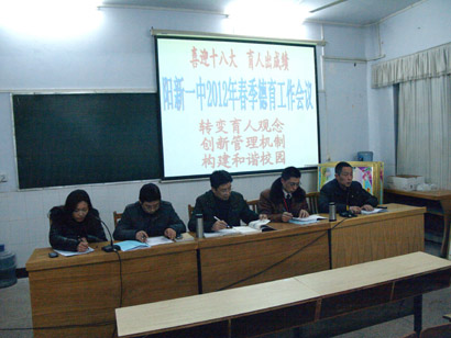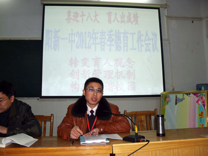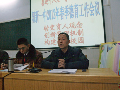 會(huì)議由團(tuán)委書(shū)記徐美姝主持。會(huì)上,政教室主任鄧家宜解讀了《陽(yáng)新一中2011—2012學(xué)年度下學(xué)期德育工作計(jì)劃》,政教室副主任石章權(quán)針對(duì)今年德育工作的新舉措——“文明班級(jí)”評(píng)比做了詳細(xì)說(shuō)明,政教室副主任秦青山借用省“班主任培訓(xùn)”中專家的一些理論結(jié)合教師工作實(shí)際與大家探討“如何做一名