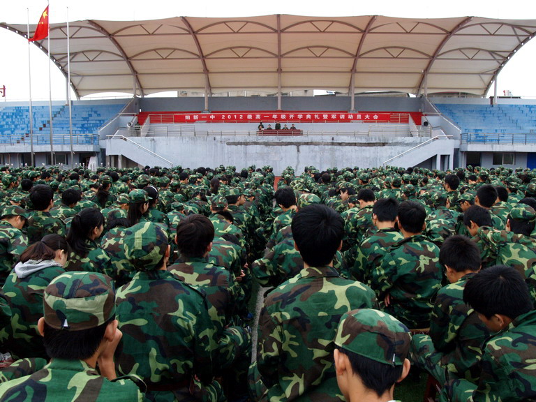 上午8時30分,在嘹亮的軍樂聲中,高一年級1200余名學(xué)生身著迷彩服,整齊而有序地進(jìn)入運動場指定位置。上午9時整,雄壯的國歌聲拉開了軍訓(xùn)動員大會的序幕。