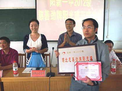 9月14日,陽新一中2012級(jí)“慈善勁牌陽光班”開班典禮在教學(xué)樓二樓電化教室舉行。勁牌公司慈善事業(yè)部主管尹琴,陽新慈善總會(huì)會(huì)長(zhǎng)王賢田,陽新慈善總會(huì)書記石教義,陽新一中校長(zhǎng)趙立中,副校長(zhǎng)梁師穩(wěn)等領(lǐng)導(dǎo)出席了開班典禮。典禮由一中副校長(zhǎng)梁師穩(wěn)主持。