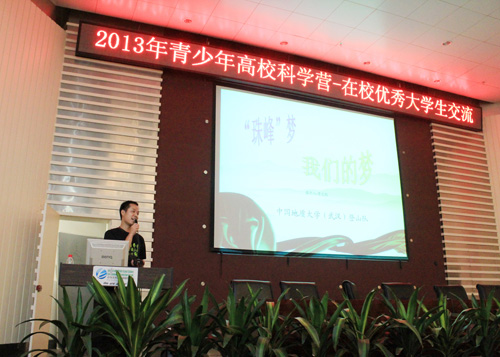 最后,在全體人員熱情的掌聲中,中國(guó)地質(zhì)大學(xué)(武漢)校黨委副書記傅安洲教授宣布2013 年青少年高校科學(xué)營(yíng)中國(guó)地質(zhì) 大學(xué)(武漢)分營(yíng)正式開(kāi)營(yíng),并作了《這是我的地大,也是你的地大》校史主題報(bào)告,講述了地大人以“艱苦樸素,求真務(wù)實(shí)”精神創(chuàng)造的輝煌歷史。