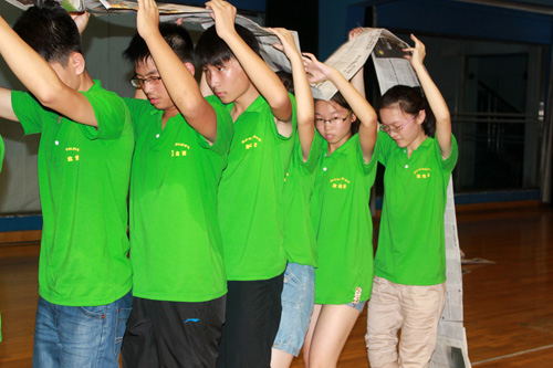 登山報(bào)告給同學(xué)們留下了深刻的印象,同學(xué)們對(duì)晚上的活動(dòng)也更加憧憬。晚飯過(guò)后,同學(xué)們就早早的來(lái)到地大體育館,為晚上的活動(dòng)做準(zhǔn)備了。7 點(diǎn)同學(xué)們?cè)隗w育老師的指導(dǎo)下整齊的進(jìn)入體育館。進(jìn)入體育館首先進(jìn)行了團(tuán)隊(duì)拓展訓(xùn)練,這 是為了讓同學(xué)們意識(shí)到團(tuán)隊(duì)的力量比個(gè)人的力量大,將“1+1>2”的道理深入他們的心里。