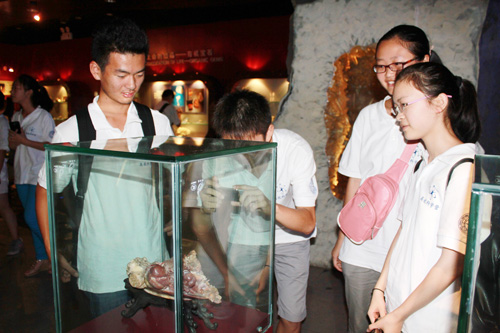 在地球奧秘展廳,講解員首先向大家介紹了恒星發(fā)熱發(fā)光的原理及分類、恒 星與行星的區(qū)別、地球的內(nèi)部結(jié)構(gòu),并且參觀了43 億年前最古老的巖石;之后,她又對(duì)隕石的分類,孔雀石的成分、用途、產(chǎn)地等作了解釋;此外,劍齒象腿骨化石、恐龍蛋化石、候風(fēng)地動(dòng)儀模型等都引起了大家濃厚的興趣。講解員特別強(qiáng)調(diào)了地動(dòng)儀的滯后性、火山噴發(fā)原理和喀斯特地貌的相關(guān)知識(shí)。