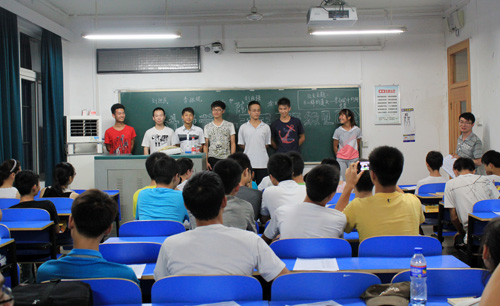 夏令營(yíng)的活動(dòng)安排很緊湊,我們剛吃完飯,就前往安排的教室參加“科學(xué)營(yíng)1班班級(jí)見(jiàn)面會(huì)”。見(jiàn)面會(huì)上,來(lái)自五湖四海的同學(xué)作了自我介紹,彼此進(jìn)行簡(jiǎn)單交流之后就是推舉班長(zhǎng)(旗手)?;顒?dòng)首先采用自薦法,由愿意擔(dān)任該職務(wù)的同學(xué)上臺(tái)演說(shuō),結(jié)果有7人參加競(jìng)選,可謂競(jìng)爭(zhēng)相當(dāng)激烈??茖W(xué)營(yíng)1班將學(xué)生劃分為四個(gè)小組,每個(gè)小組都有人參與競(jìng)選。我們陽(yáng)新一中的學(xué)生被劃分在第四小組,表現(xiàn)突出,有劉世民和李瀚兩位同學(xué)參加競(jìng)爭(zhēng),而且實(shí)力不凡,只是運(yùn)氣差一點(diǎn),均以一票之差落敗。但我對(duì)他們的首次表現(xiàn)感到驚訝,并期待他們?cè)诤竺娴幕顒?dòng)中有更突出的表現(xiàn)。