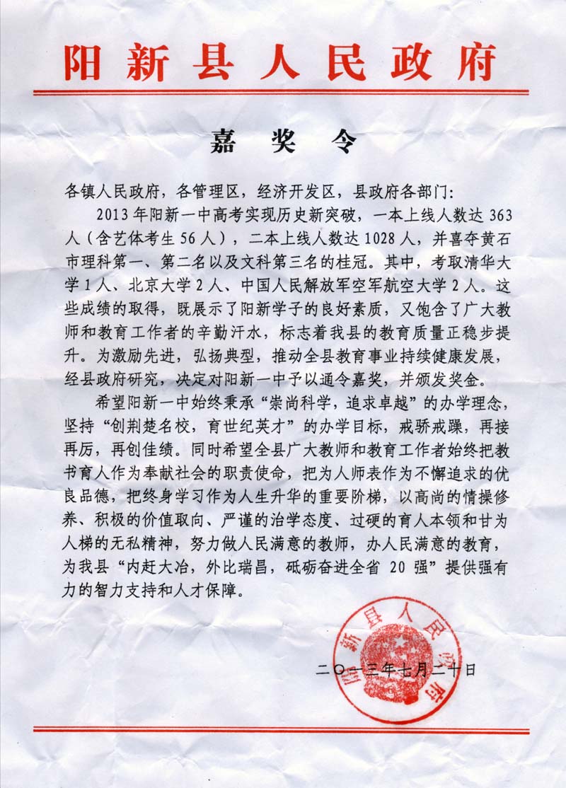 陽新縣政府為我校頒布嘉獎令